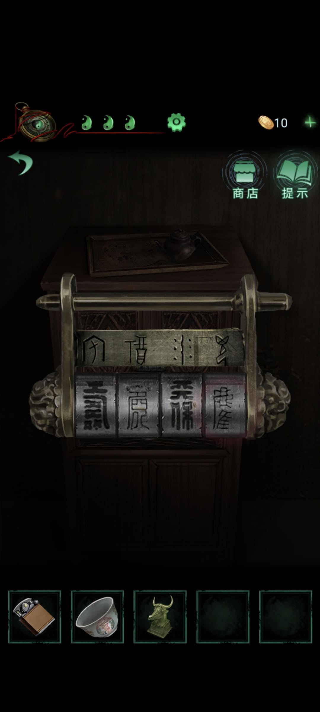 左邊石獅可以裝撥號盤,密碼由左至右:壬、丙、丁、己、甲,移動撥號盤的方式是,把要的字轉到三角形→得到鑰匙,離開前要把撥號盤取下帶走