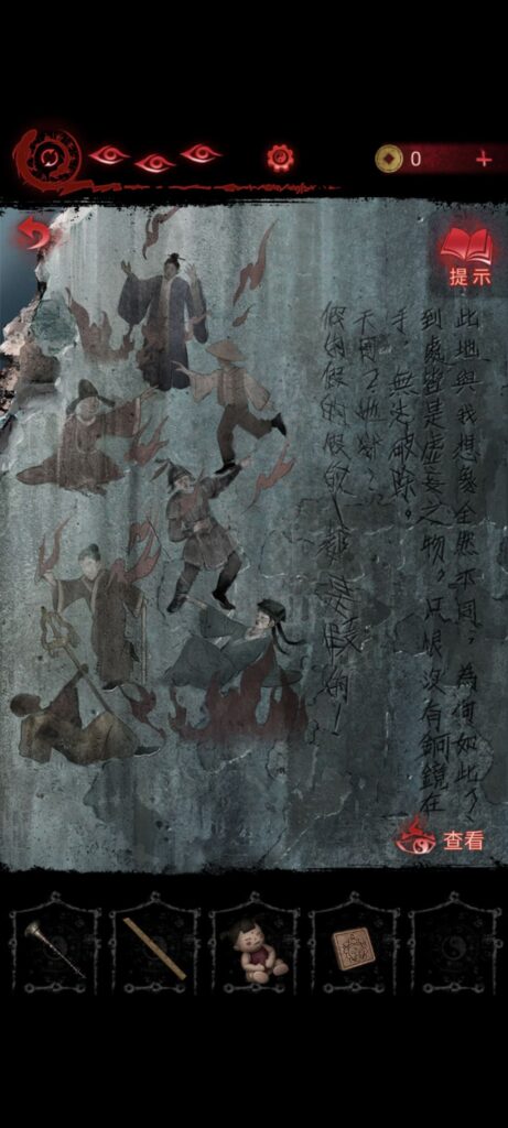 2.右前方石碑刻有凌亂的字,字中訊息提示,如果有鏡子可以打破這裡的虛妄