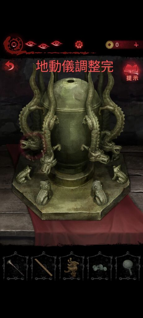 3.進入迷宮到地動儀,放入青銅球,地動儀出現變化,要找到機關