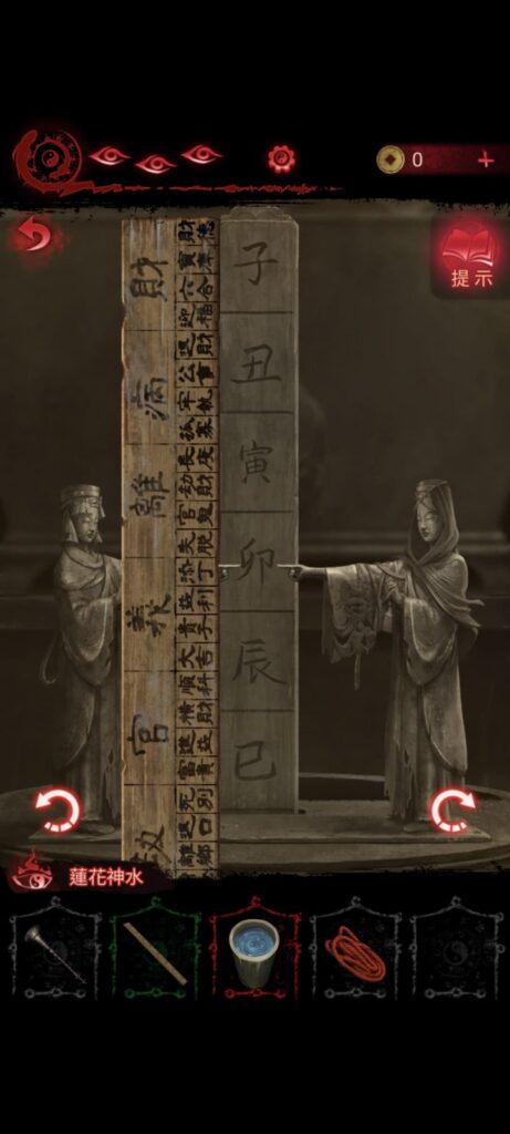 3.輸入密碼147(左)、126(右),打開神龕,看到提示紅絲鑄血、蓮花澆魂,把紅線綁上雕像、再淋上蓮花神水→得到雕像